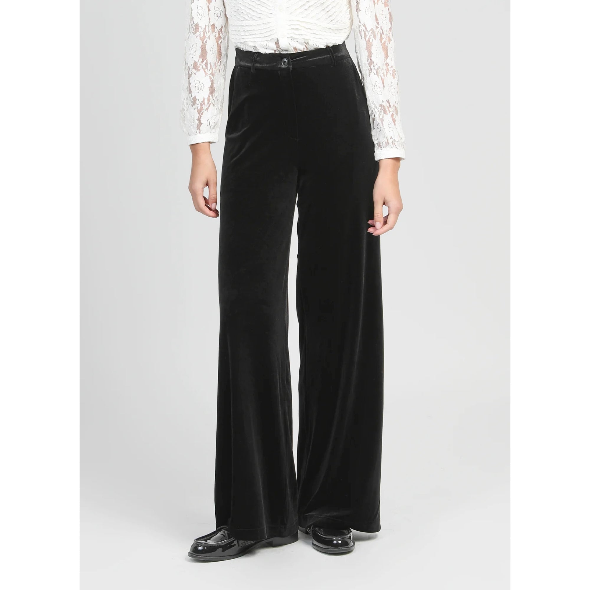 These velvet style trousers have a soft feel and a comfortable fit. Featuring a zip fly front and side slit pockets and flared hem. Made from 95% Polyester 5% Elastane.