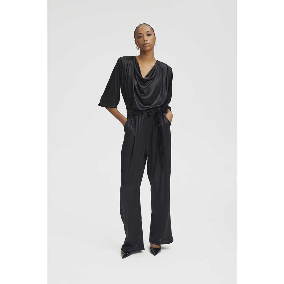 We love this cool jumpsuit from GESTUZ. This style will transcend all seasons. Featuring a draped front, wide leg trousers with pockets. Fit true to size. Made from 95% Polyester, 5% Elastane