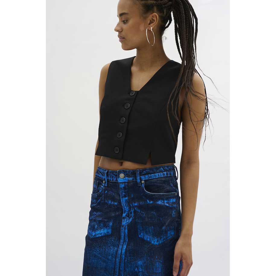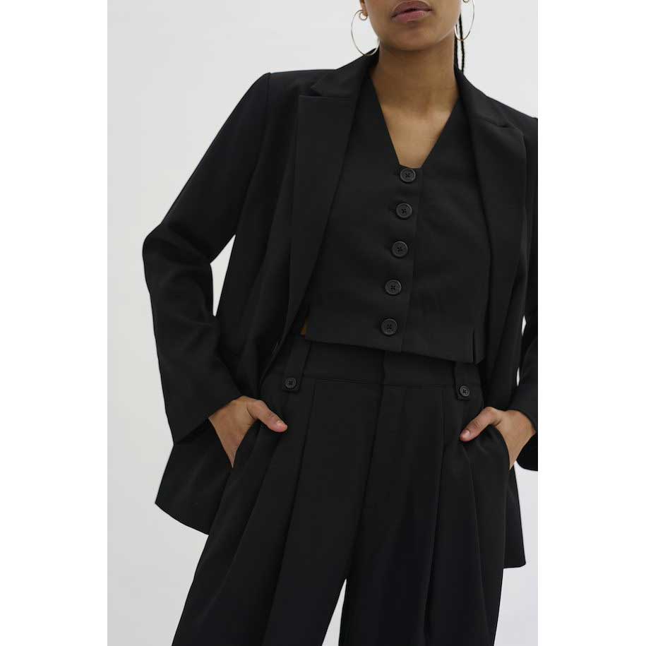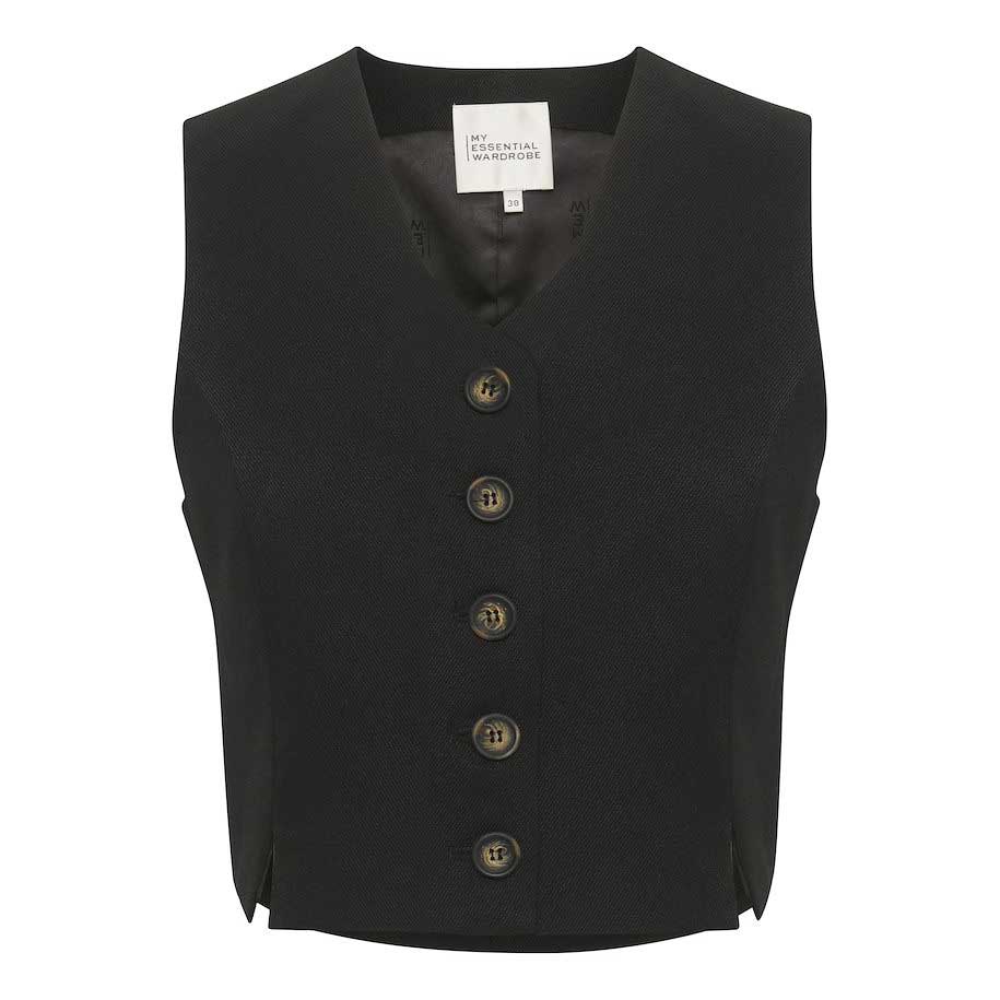 This black tailored vest is a timeless must-have for your wardrobe. Designed with a subtle V-neck, shaping darts and a button closure in the front, this vest will look great with everything and is perfect to wear with both jeans, our Louis Skirt or matching tailored pants. Made from 60% Polyester (Recycled), 37% Polyester, 3% Elastane. Matching Trousers and Blazer available.