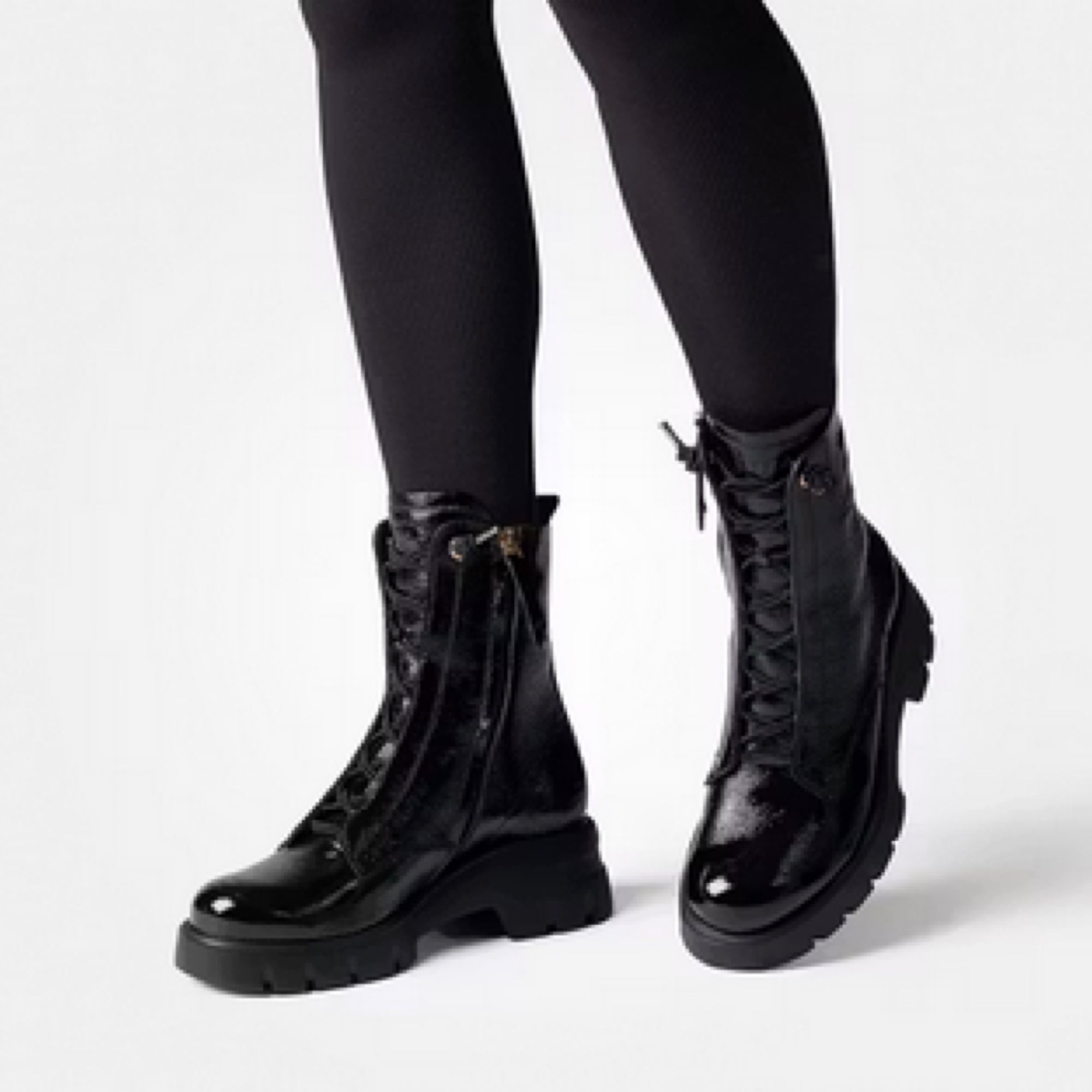 These Paul Green lace up boots are made from a wetlack leather and feature a chunky sole, laced front and a side zipper. This eye-catching sole with its funky frame rounds off the cool look perfectly. Treat yourself to this fashion highlight! Paul Green makes shoes with great passion and mastery, which is expressed in perfection, quality, style and fit. The result: a unique, uplifting feel! The Paul Green effect.