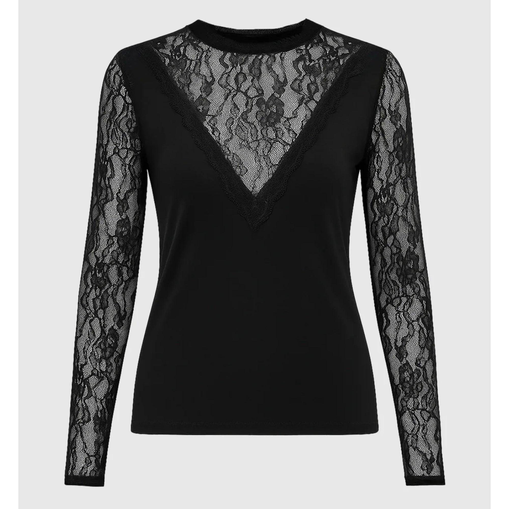 This stretch lace top is perfect on its own or as a layering style! Featuring a round neck with lace neckline and full length sleeves. Made from 92% Polyester 8% Elastane. Machine wash@ 30C