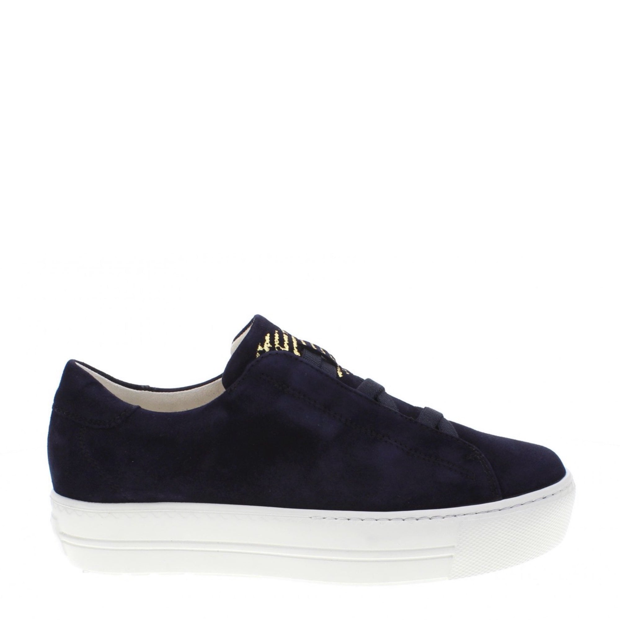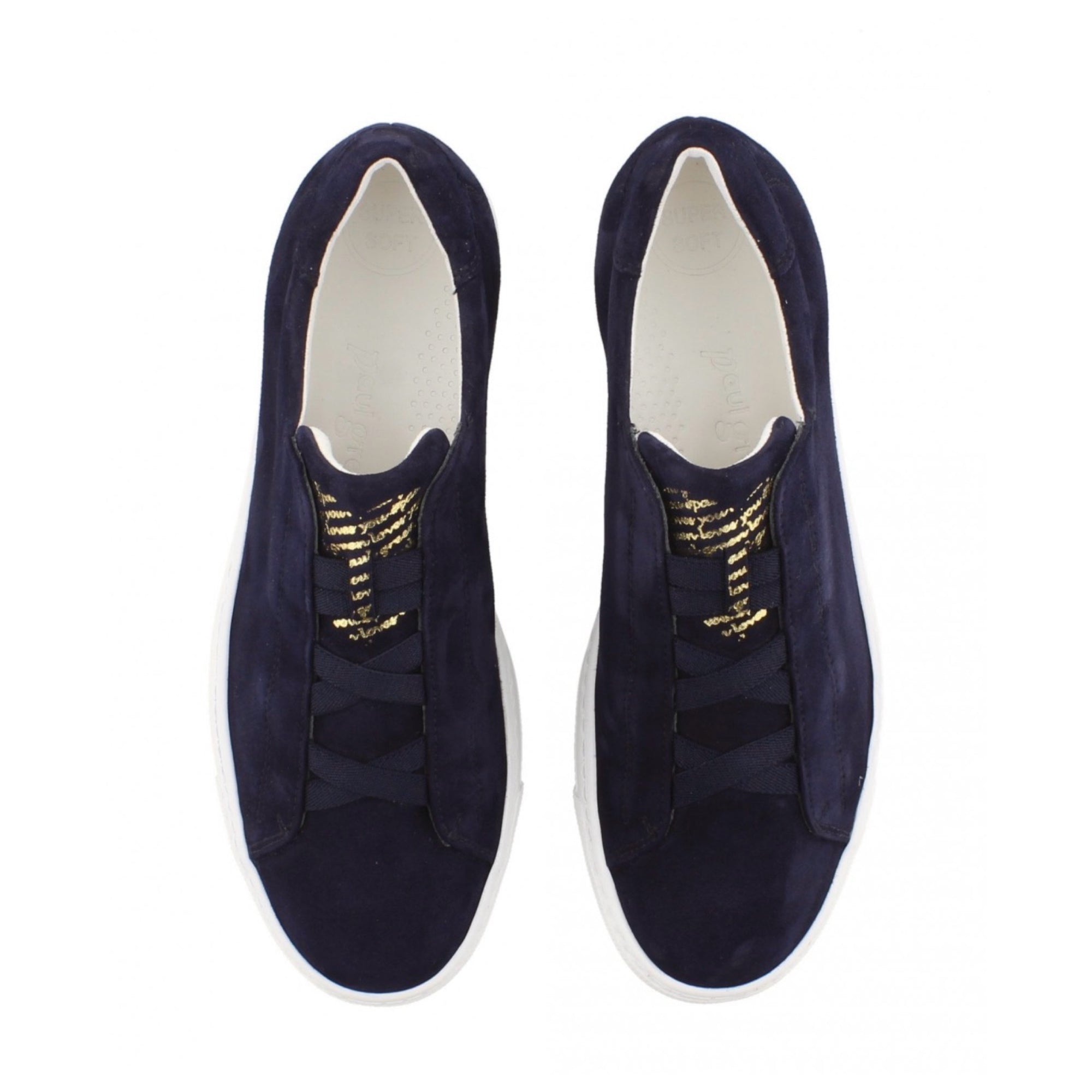 Look forward to the new sneaker from Paul Green! He picks up all the brilliant and popular trends, and skillfully combines them into a very special shoe. The iconic white sole is super hip due to its platform. Golden details, as well as a quick lacing system casually round off the exclusive soft suede . Enjoy the pleasant comfort due to the supple leather lining and the softly padded heel cap. Fit-to size. Also available in White leather and Black suede