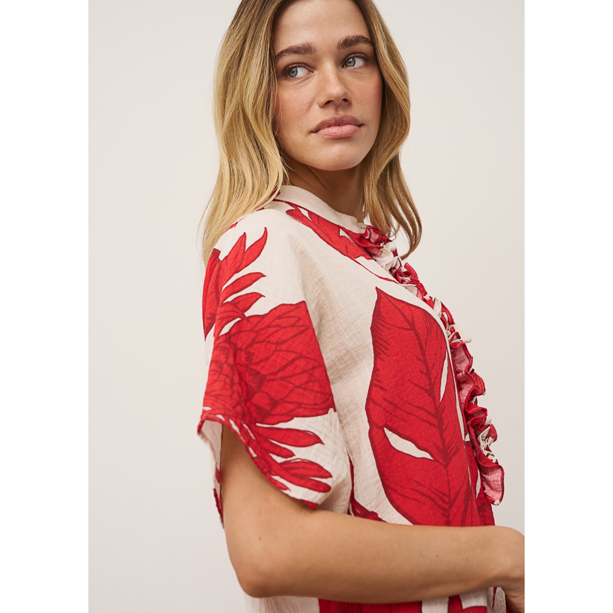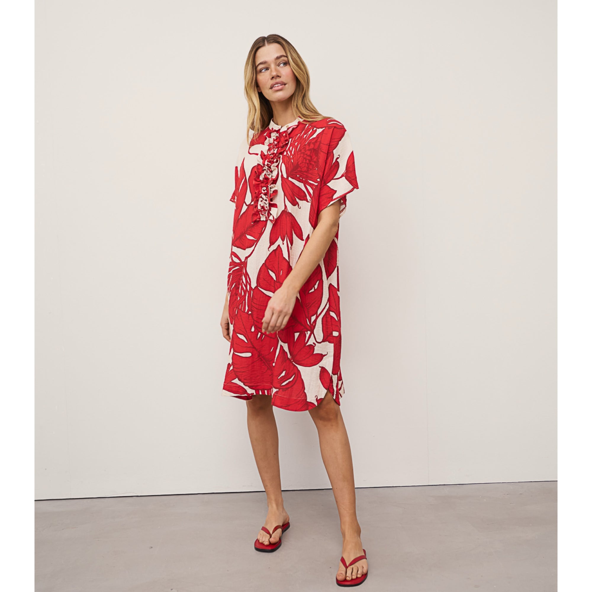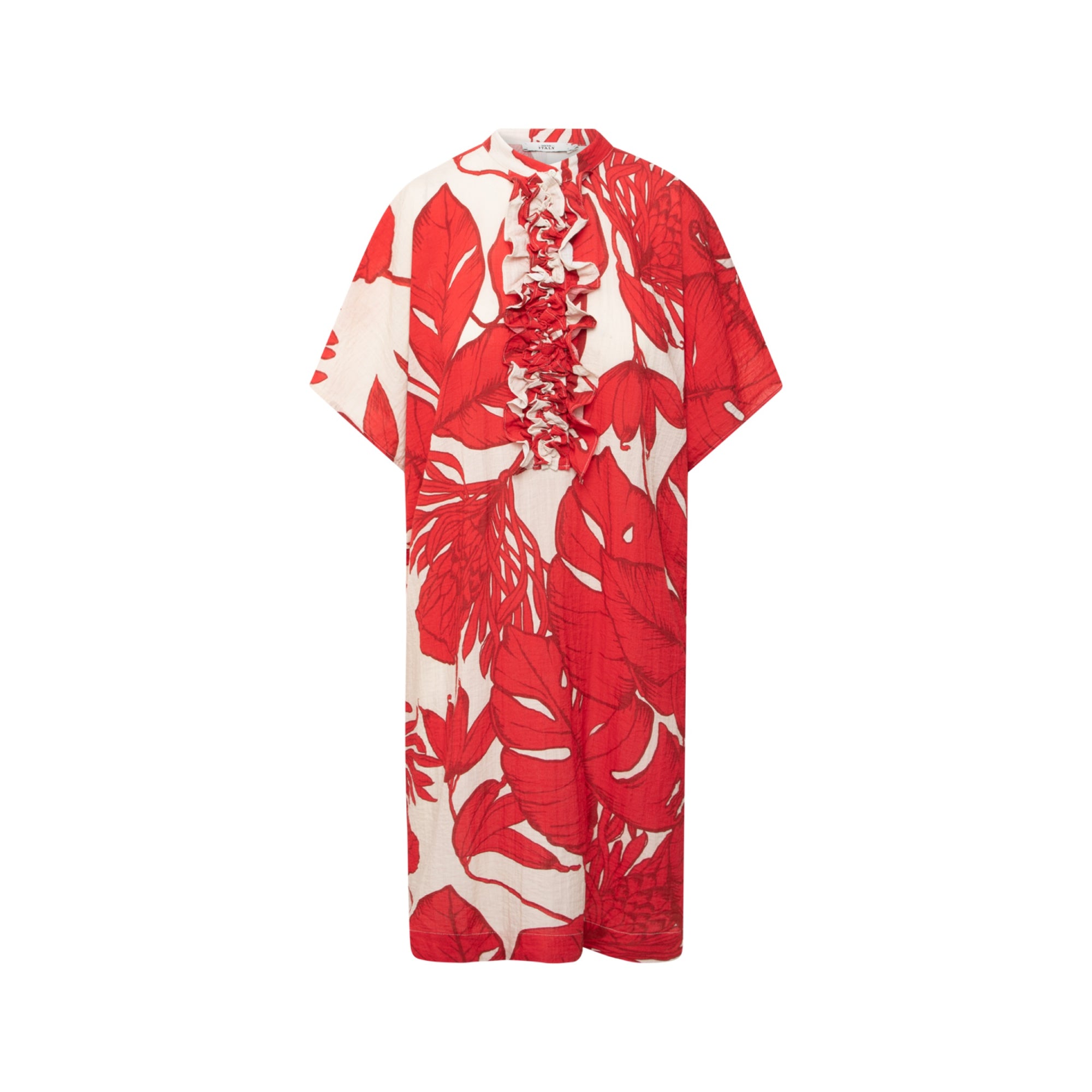 We love this fabulous dress from 0039 Italy. Featuring an all over print, side pockets, ruffle and buttoned front. Made from 100% Cotton. Fit true to size.