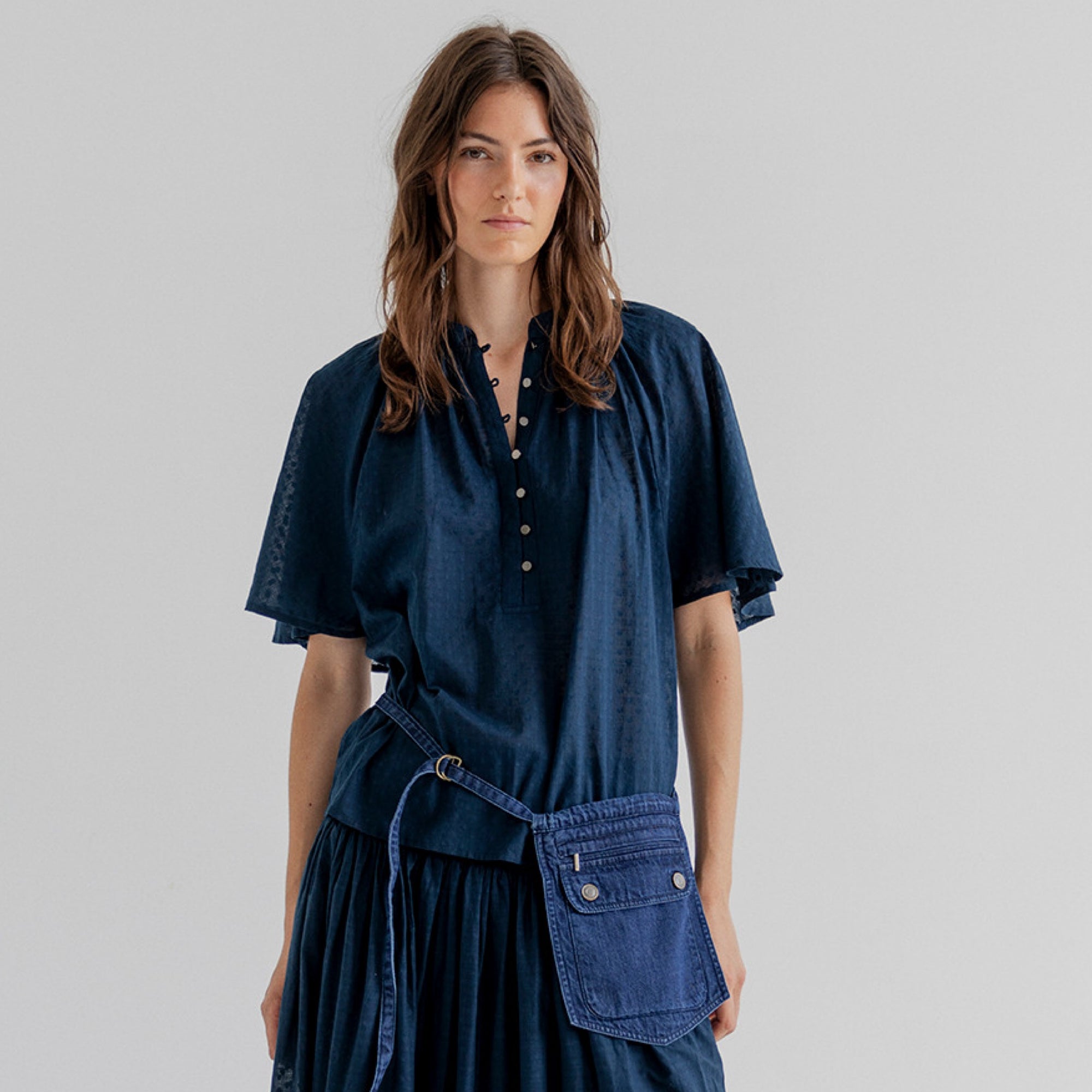 SANDIE is a feminine short-sleeved shirt with a soft A-line silhouette. Cut with wide raglan sleeves and a loose fit for an effortlessly flattering shape. The fabric feels incredibly soft and comfortable, making it an easy favorite for transitional dressing.
